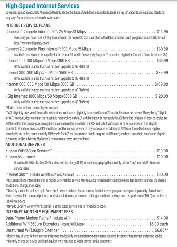 (*Applies to all standard installations for homes with existing wiring that are up to 150 feet from an access point on Mediacom’s network. Some installations require custom work and prices may vary. Relocation of existing wiring, additional outlets, wall fishes and other custom work is not included.)